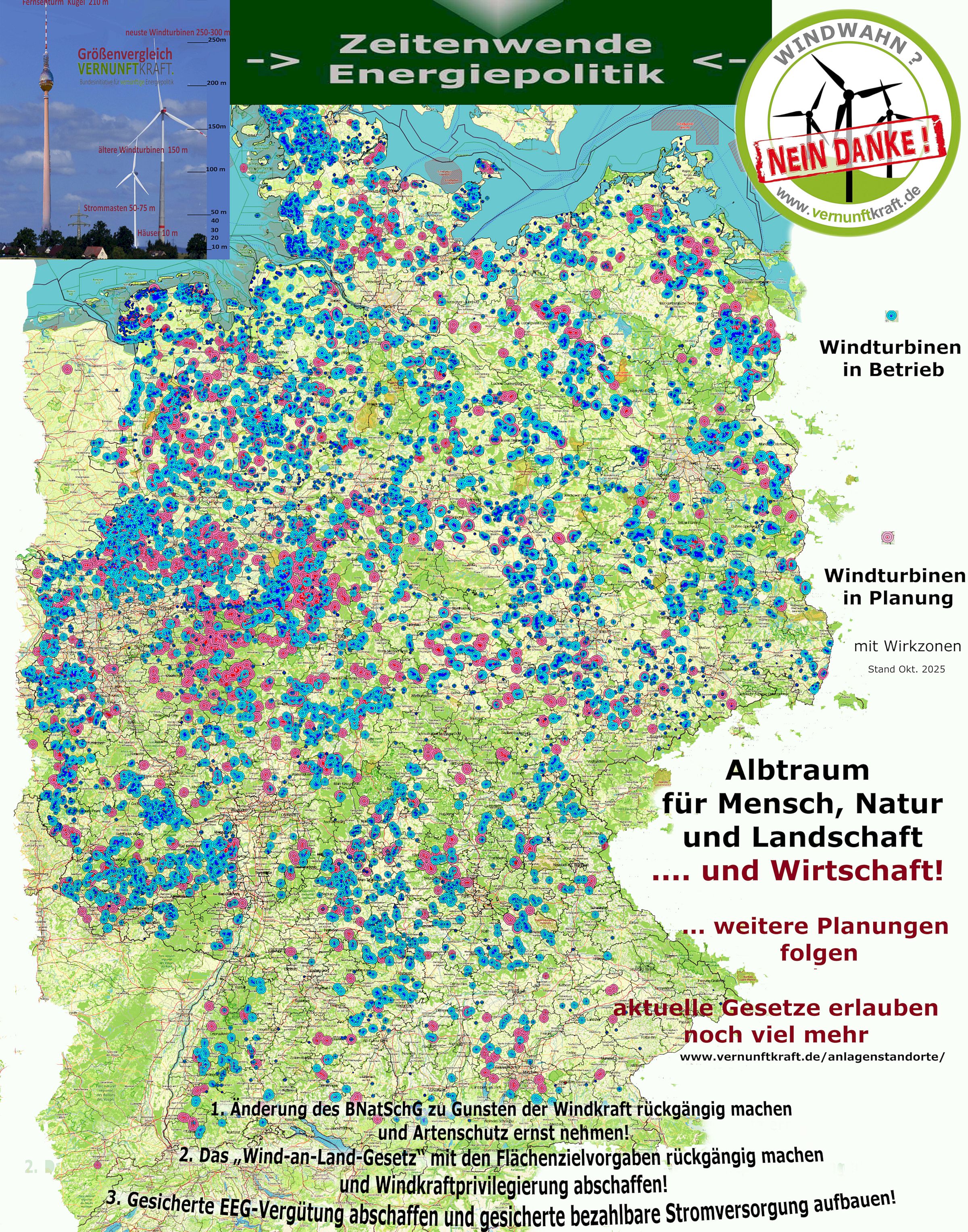 Karte aller gebauten Windturbinen (inc. Ggenehmigungsverfahren) mit Wirkzonen zum reinzoomen (Okt. 2025) ->Link