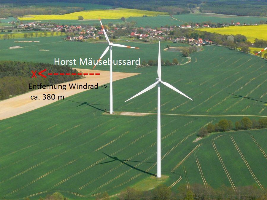 Schlagopfer eines Mäusebussard. Entfernung zur Windkraftanlage 380 m. Der Mäusebussard weist mit Abstand die höchsten Schlagopfer auf, gehört ab nach BNatSchG §45b nicht zur Liste kollisionsgefährdeter Brutvogelarten mit definierten Schutzabständen.