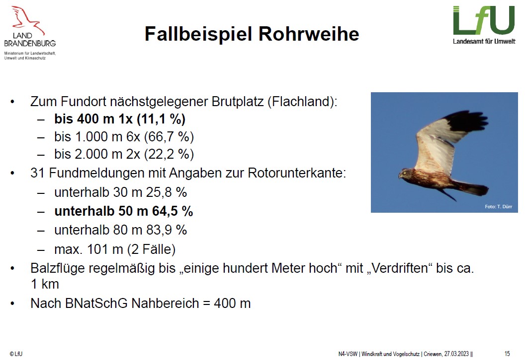 Laut BNatSchG (2026) sind Rohrweihen nicht kollsionsgefährdet, wenn Rotoren 50m über Grund liegen ->Link . Falsch! Die Auswertungen der Vogelschutzwarte Brandenburg zeigen Schlagopfer auch in oberen Bereichen über 50 m!