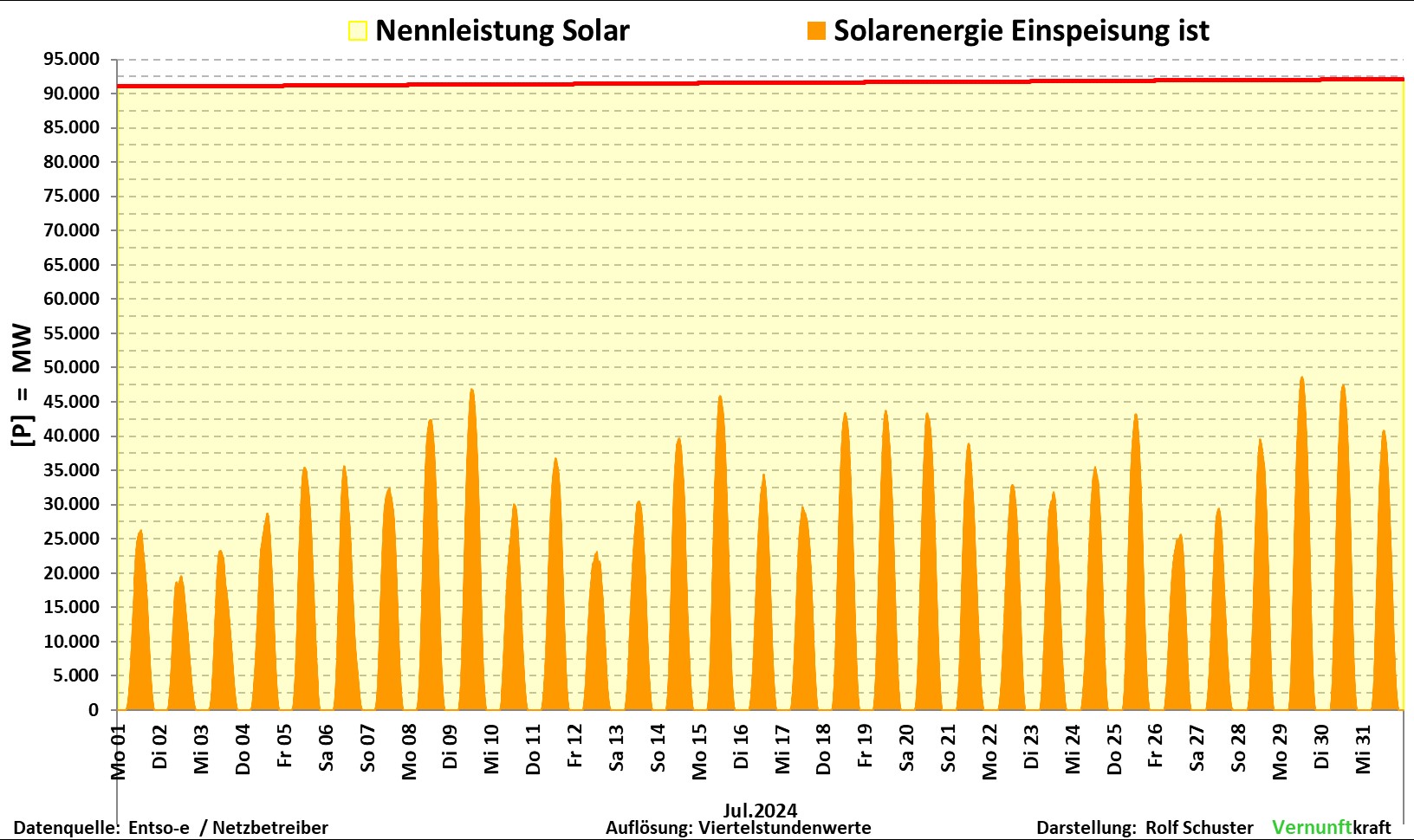 Die Spitzen des Solarstrom sind sehr steil und erreichen Mittags den Höchststand. Fallen dies bis zum Abend, müssen konventionelle Kraftwerke oder Pumpspeicherwerke dies ausgleichen.