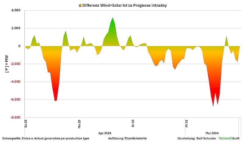 „Im Juni 2019 traten mehrere Tage mit massiven Prognoseabweichung im Bereich Windenergie und Photovoltaik auf. Die Abweichung zwischen der angenommenen Einspeisung aus erneuerbaren Energien und der tatsächlichen lagen bei +/- 5.000 MW, in Spitzen sogar bei 13.000 MW. Diese Mangelerzeugung bzw. Überspeisung in Deutschland führte dazu, dass die gesamte europäische Regelleistung aufgeboten werden musste, um massive und für die Stromversorgung äußerst kritischen Frequenzeinbrüche oder Überfrequenzen noch in tolerierbaren Grenzen zu halten.“ ->Link