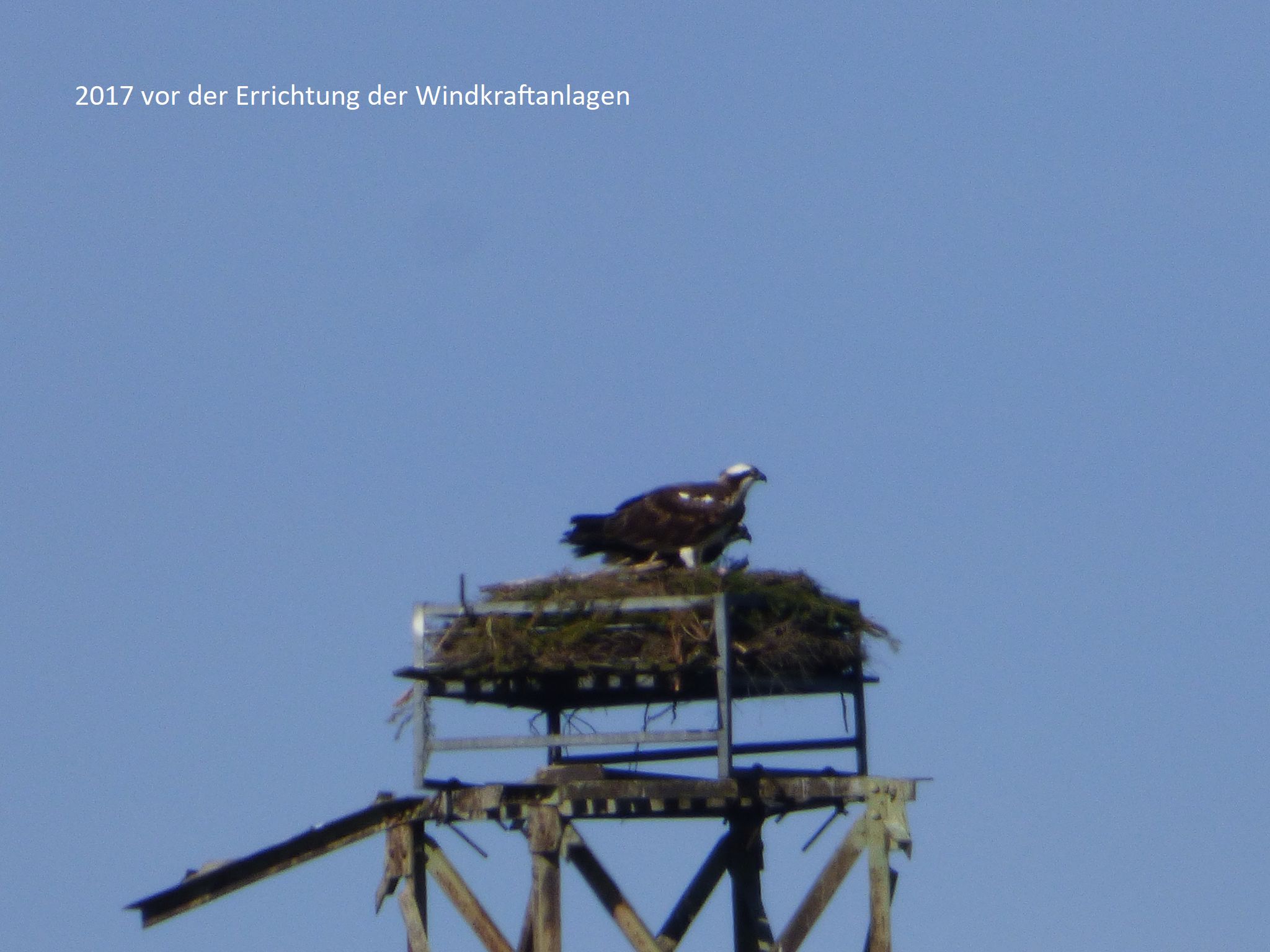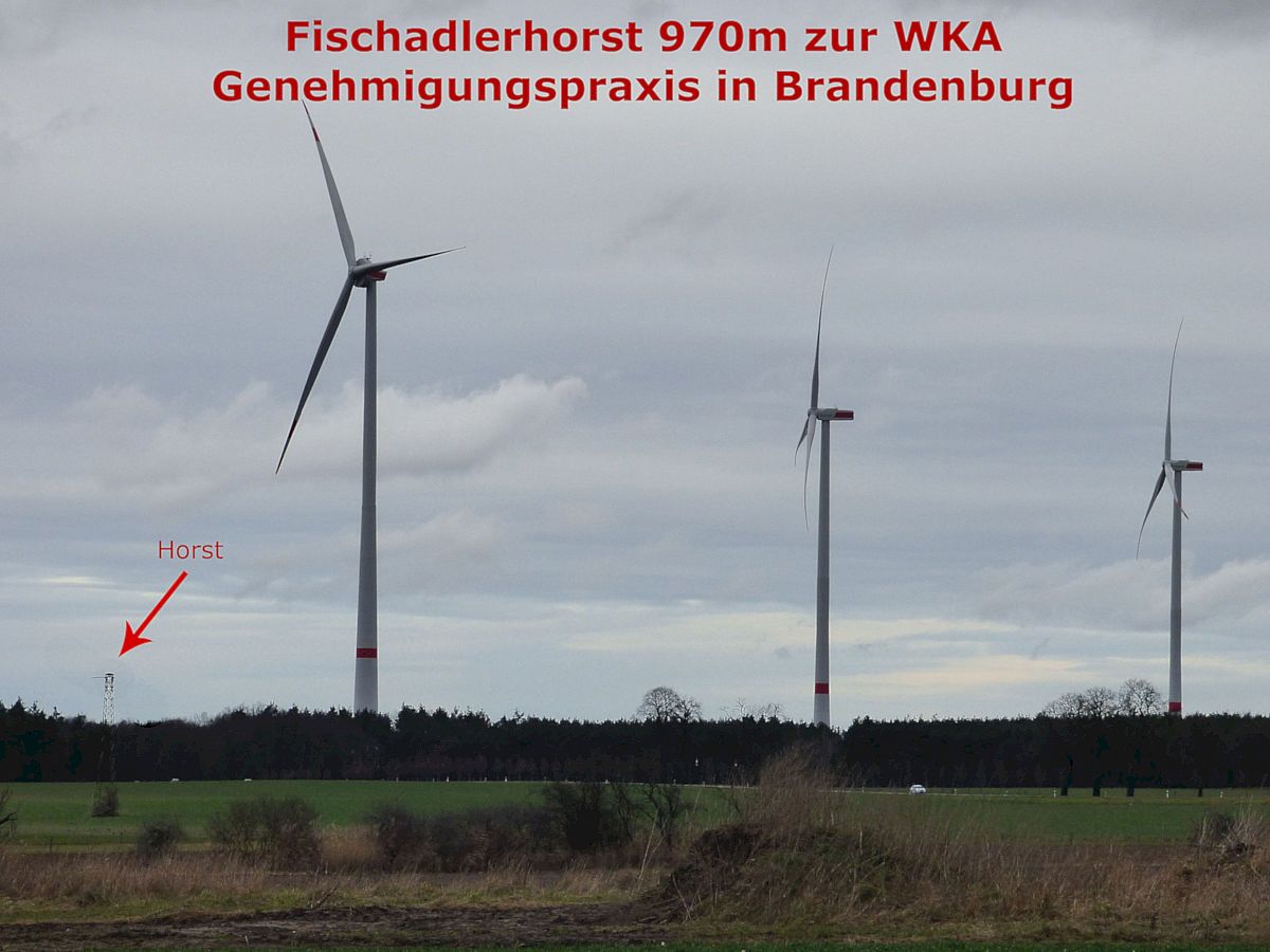 Vergrämung: Der Fischadler-Horst war nach der Errichtung von neuen Windkraftanlagen mit 250m Gesamthöhe in 970 m nicht mehr besetzt.
