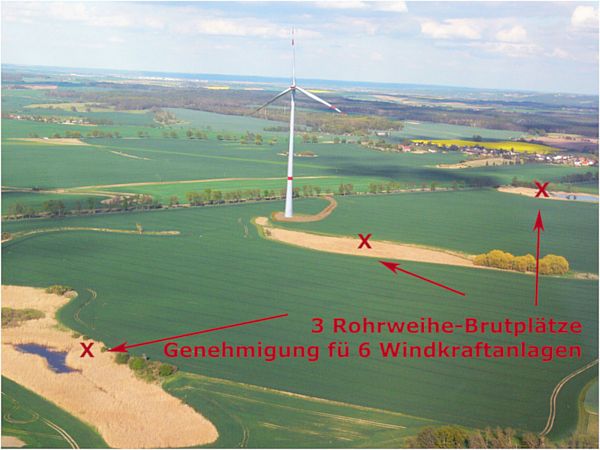 Windfeld mit 6 Anlagen im Nahbereich mehrerer Rohrweihe Brutplätze. Abstand Fundament zum Schilfgürtel 40-120 m. Rotoren ragen mit Rotorlänge von 75 m in den Schilfbereich.
