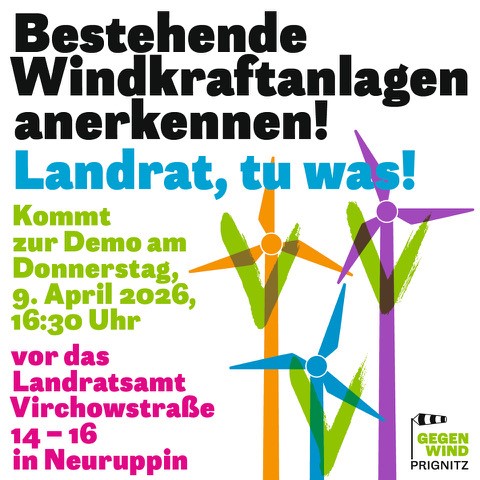 09. April 2026 - Demo in Neuruppin Zahlreiche Bürgerinitiativen aus der Prignitz fordern vom Landrat endlich vohandene, bereits stehende Windkraftanlagen im Regionalplan anzuerkennen. Nur in der Prignitz betrifft dies über 200 Anlagen ->Link