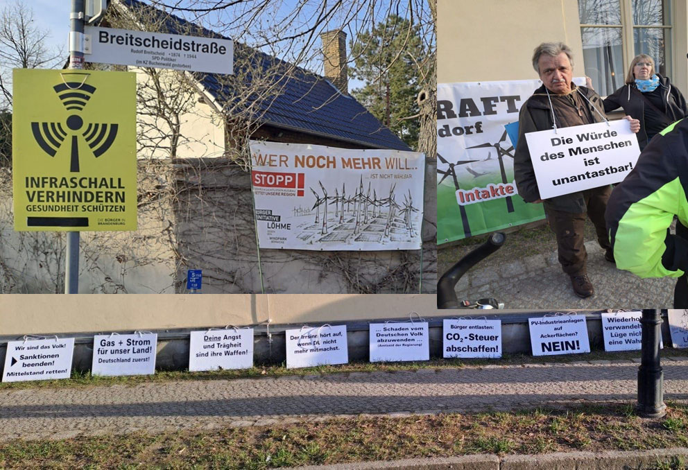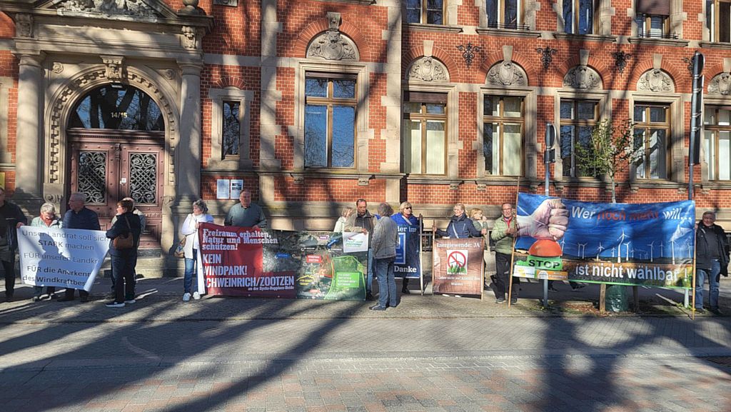 11. November 2024 - Protest in Kyritz zur Sitzung der RV Vor dem Kulturhaus in Kyritz haben sich über 50 Menschen zusammengefunden, um gegen einen weiteren Ausbau der Windkraft in der Region zu protestieren. In der konstituierenden Sitzung der Regionalversammlung wurden von den eingereichten Fragen der Bürger nur zwei zugelassen, die anderen "bezögen sich nicht auf die Tagesordnung der Sitzung“, so der Vorsitzende OHV Landrat Alexander Tönnies. Somit wurden auch alle Fragen in Anlehnung an das „Empfehlungspapier“ der Bürgerinitiativen nicht zugelassen. In einer Region, in der Windkraftanlagen wegen mangelnder Netzkapazität immer öfter stillstehen, ist die Akzeptanz für einen weiteren Zubau schwer vermittelbar. ->MAZ