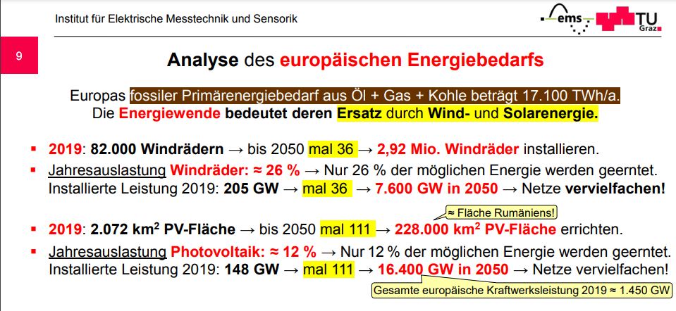 Der Energiebedarf in Europa ist gigantisch und nicht mit Wind+Sonne zu decken. aus dem Vortrag von Univ.-Prof. Dipl.-Ing. Dr. techn. Georg Brasseur (Uni Graz, Österreich) ->Link stammt diese Folie