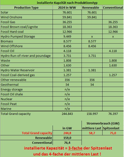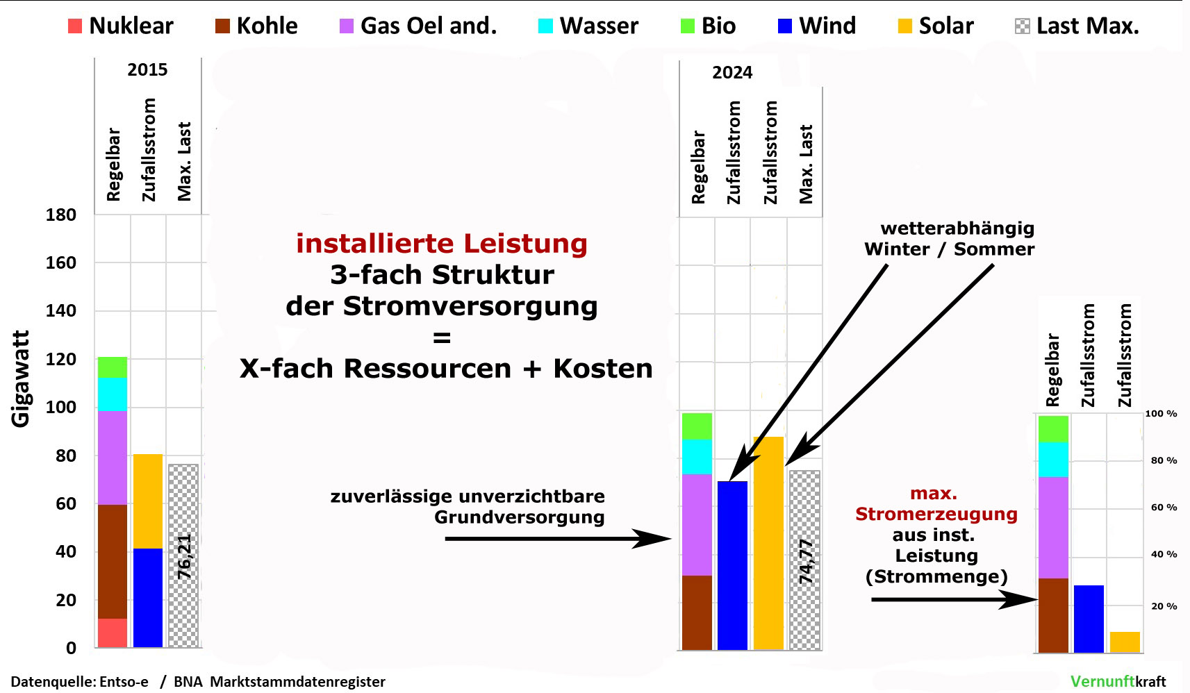 Aktuell wird in Deutschland eine 3-fach Struktur für die Stromversorgung aufgebaut mit den entsprechenden finanziellen und ökologischen Folgen. Beachte - die installierte Leistung hat nichts mit der gelieferten Strommenge zu tun.