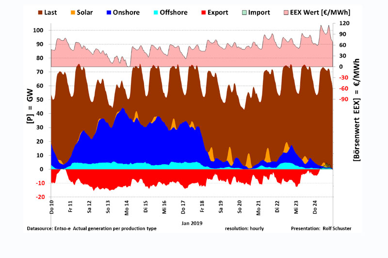Für Deutschland bedeutet das laut einer Studie der DeutschenEnergieAgentur, 2050 wird Deutschland trotz Landschaftszerstörung im Jahressaldo etwa 134 Terawattstunden – rund 22 Prozent des inländischen Stromverbrauchs – aus dem Ausland importieren müssen. Ohne konventionelle Kraftwerke geht es nicht! ->Link
