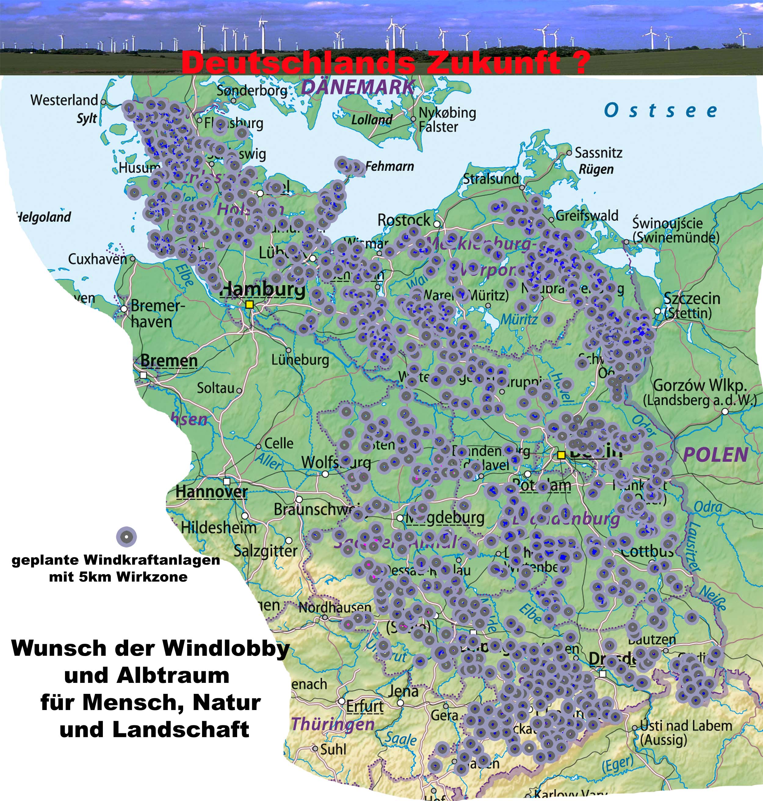 Ergänzung 2024: Auch wenn man eine Leistungssteigerung neuer Windkraftanlagen berücksichtigt ->Link (S.40), wäre die verbrauchte Fläche riesig. Weitere Flächenberechnungen hier ->Link. Praktisch ist der weitere Zubau von fast 70.000 Windkraftanlagen nicht umsetzbar. Hierbei ist nicht mal der benötigte Bedarf für Verkehr und Wärme einbrechnet. Hinzu kommen würden weitere Energie-Wandlungsverluste im Power-to-X Verfahren.