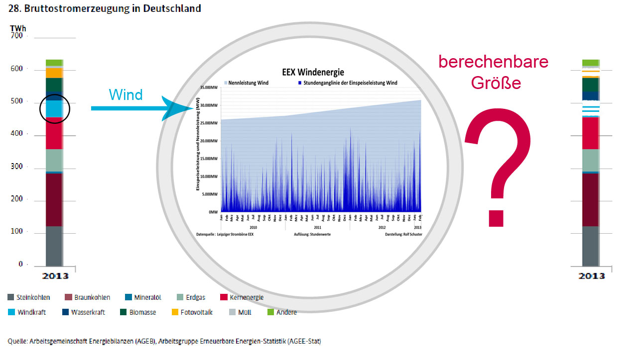 Aber Achtung! diese Grafik ist nicht korrekt, denn für Sonne und Wind müssen immer 100% konventionelle Kraftwerke für viele Tage der Dunkelflaute bereit stehen. Eine Studie der Hertie School ergab ein Energiedefizit von 9 Wochen ->Link. Sie sind also nur RECHNERISCH in der Bilanz zu betrachten.