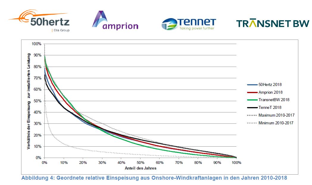 Grundsätzlich ist die Auslastung der Anlagen sehr bescheiden, wie man an der unteren Grafik aus dem Bericht der deutschen Übertragungsnetzbetreiber zur Leistungsbilanz 2018-2022 erkennen kann. Einspeisung mit 50% der installierten Leistung erreichen die WKA an nur ca. 36 Tagen des Jahres:
