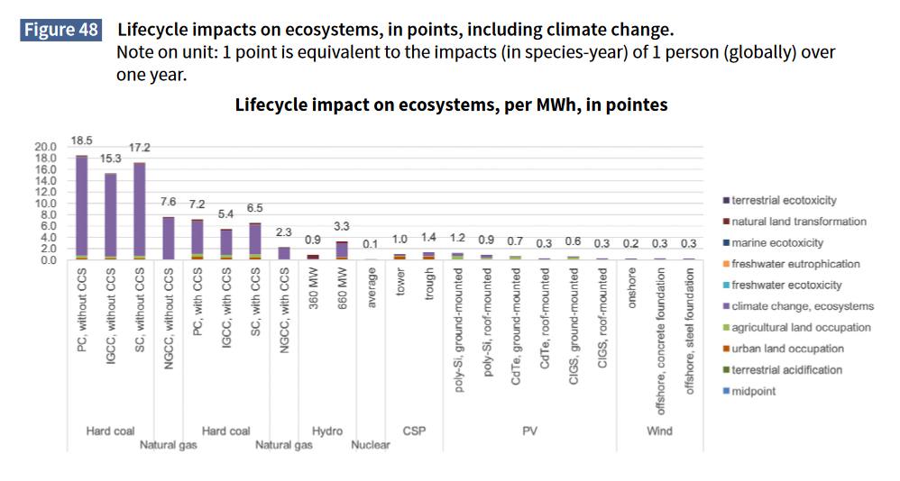 – Kernenergie ist unter dem Strich die Energiequelle mit den geringsten Auswirkungen auf Ökosysteme (Klimawandel mit berücksichtigt). Sie verursacht 3 bis 10 Mal weniger Umweltschäden als Wind oder Solar (Grafik 48).